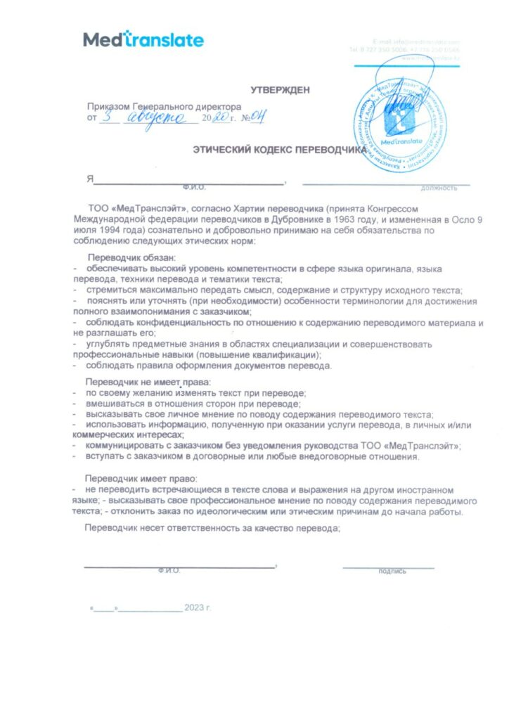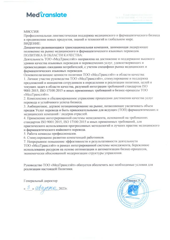 Деятельность ТОО «МедТранслэйт» направлена на достижение и поддержание высокого уровня качества медицинских переводов и переводческих услуг, удовлетворяющих и превосходящих ожидания потребителей, с учетом специфики рынка медицинских и фармацевтических переводов.